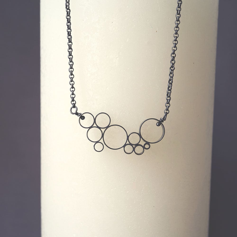 The Signature Bubbles Necklace is the heart of the Bubbles Collection — bigger than the Mini Bubbles, smaller than the Statement Bubbles, and always one of a kind. Each necklace is handcrafted in sterling silver with a unique arrangement of softly rounded bubbles, making every piece a numbered original. This version is finished with an oxidized patina, giving the silver a deep, blackened tone that enhances its sculptural detail and adds a moody, modern edge.