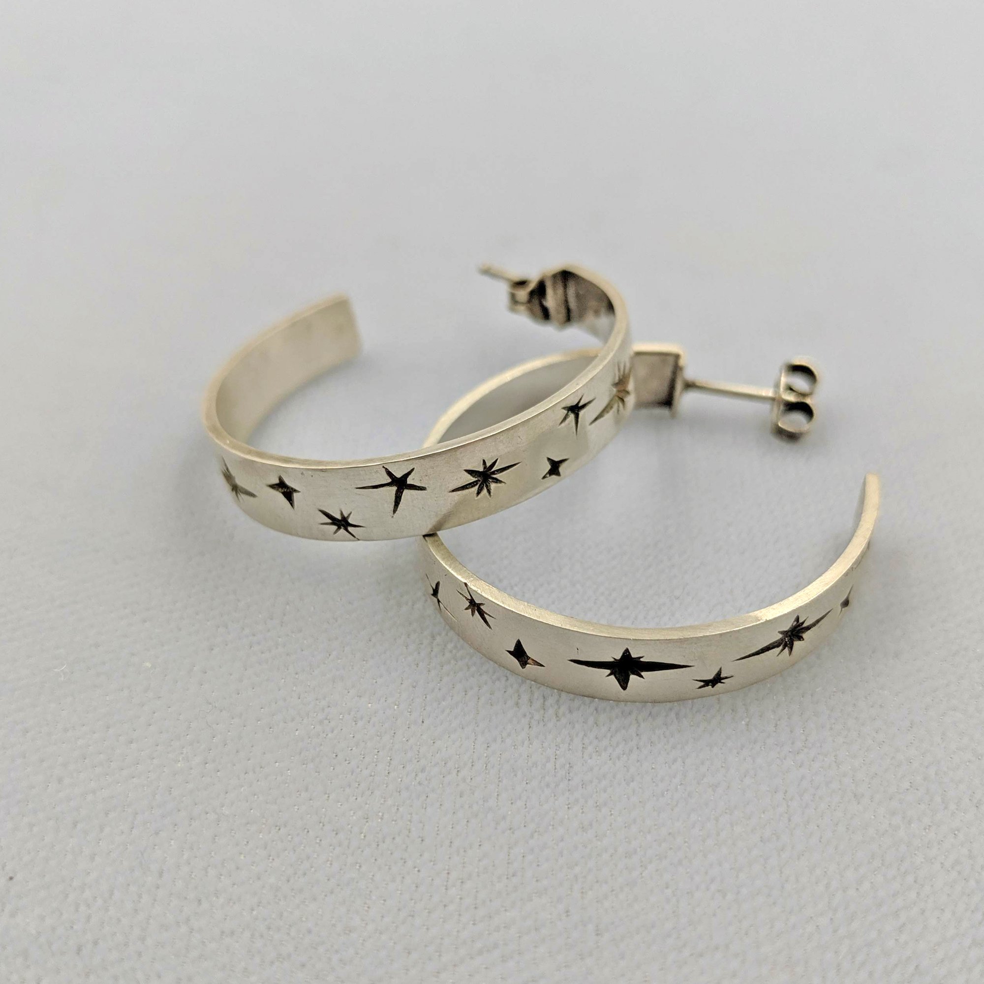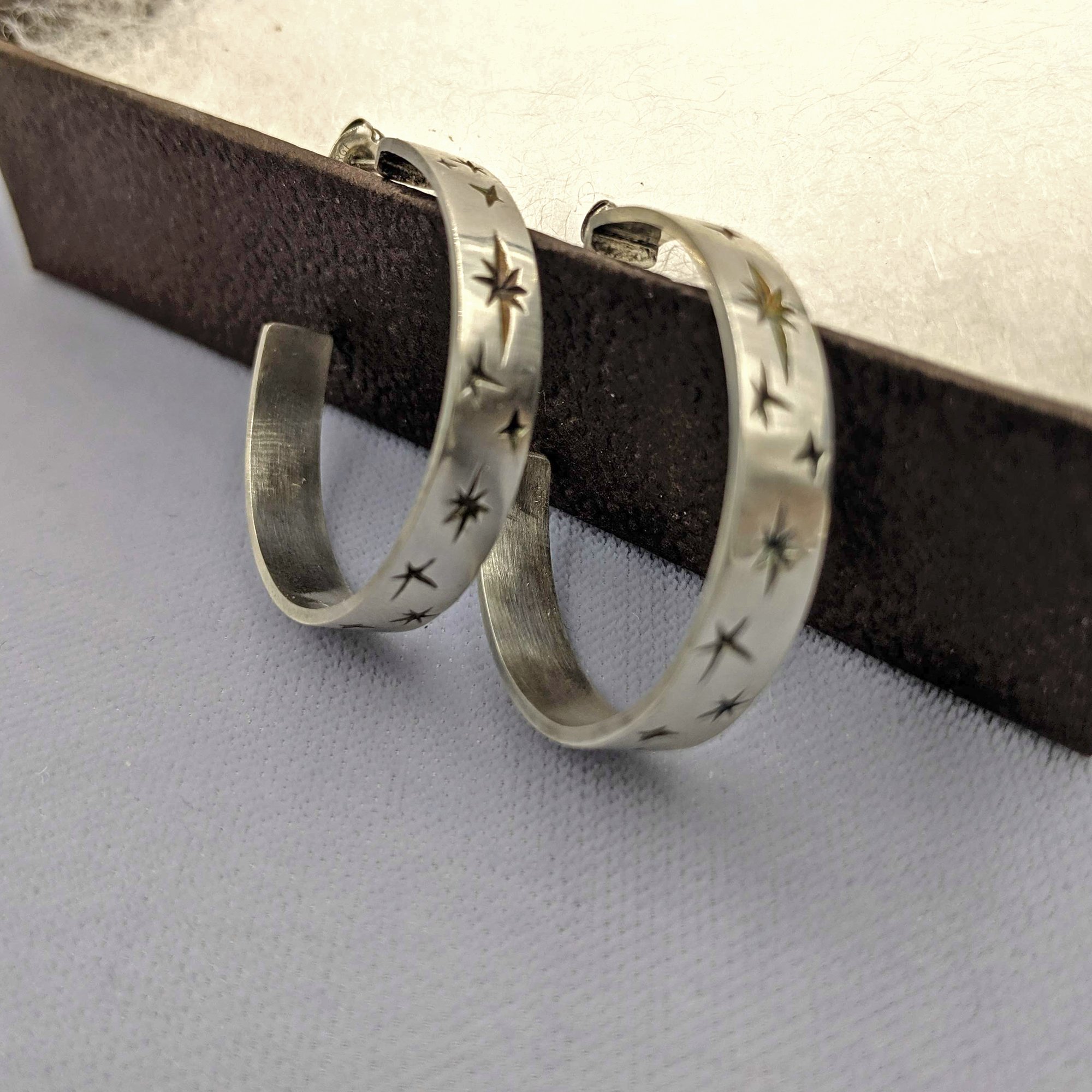 Hoops with carved stars, made out of wax. Finished with a black patina to bring out the stars against the bright silver.